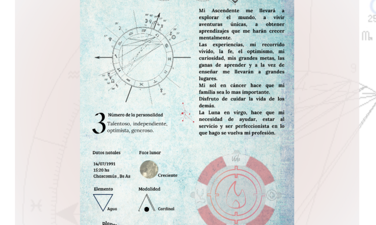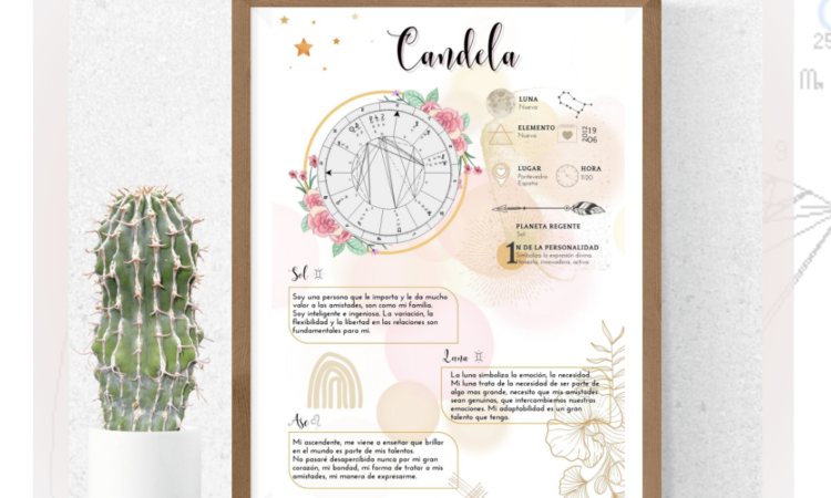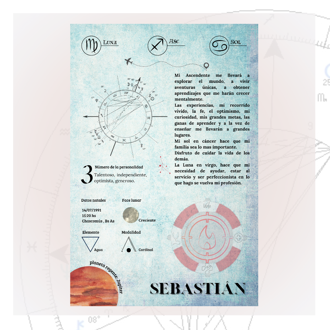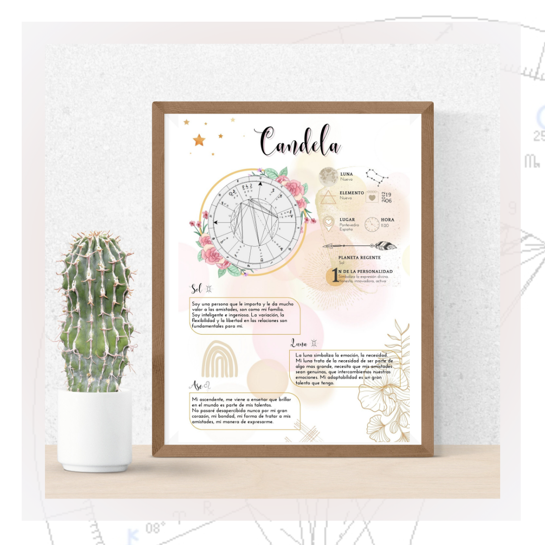 Realizo láminas personalizadas, en donde hay un detalle del sol, luna y asc. Numero de la personalidad, carta natal, elemento, luna naciente, etc.